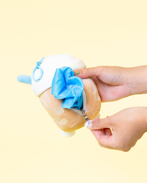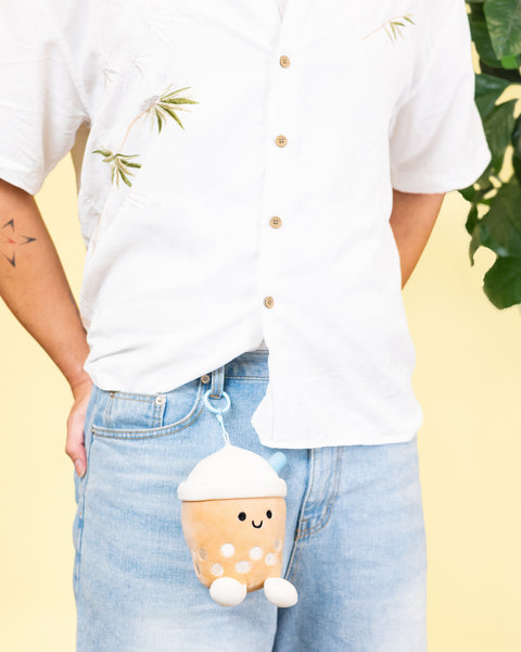 Meet Milky our Milk Tea Plush Boba Tote and Drink Carrier! He's a 3-in-1 plush, keychain, and tote drink carrier.